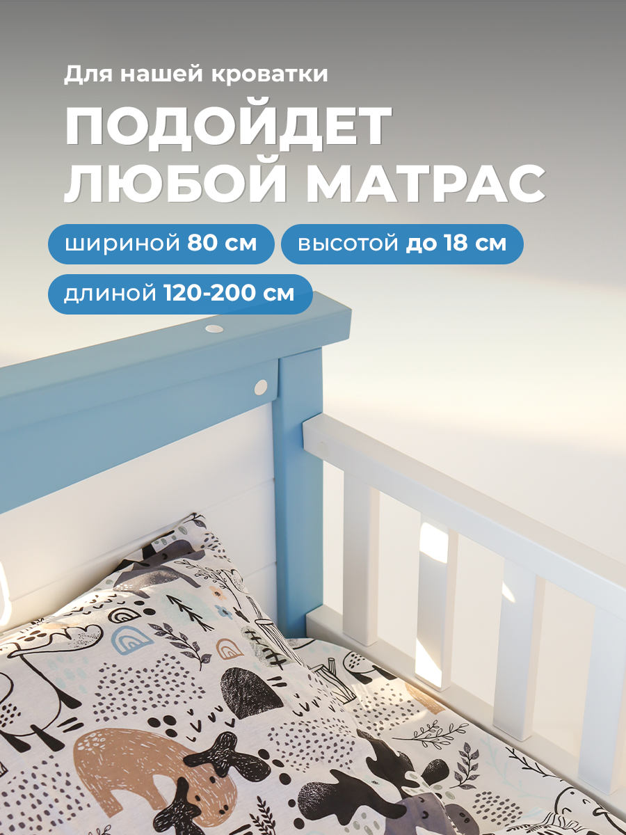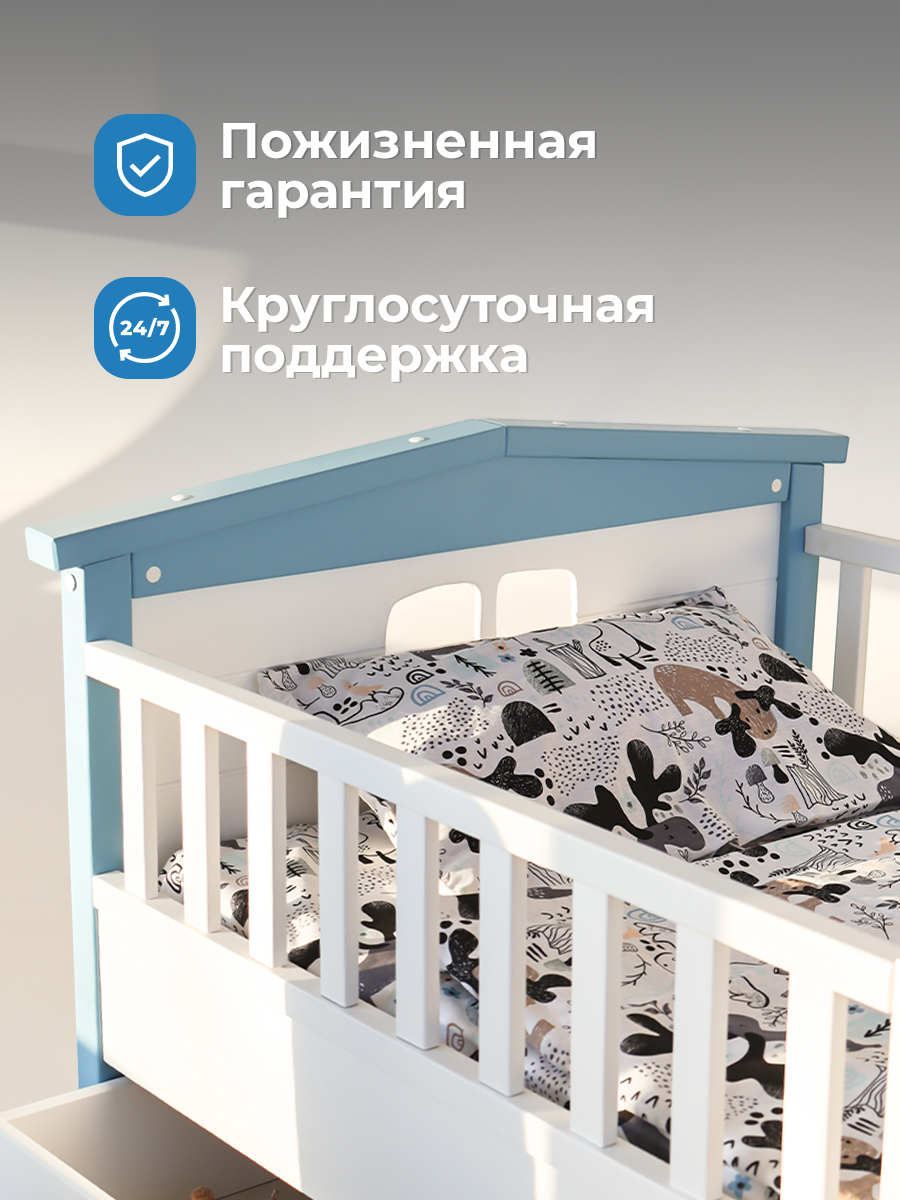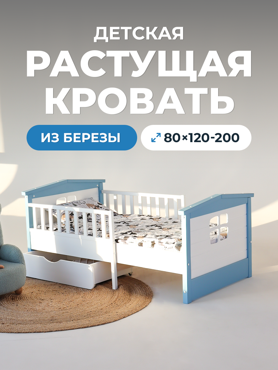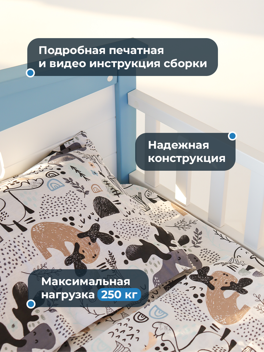 Растущая детская кровать Teddy из березы в белом и голубом исполнении - идеальное решение для создания комфортной и стильной обстановки в комнате вашего маленького принца. Эта прекрасная односпальная кровать объединяет в себе высокое качество материалов, практичность и очаровательный дизайн, делая ее идеальным выбором для мальчиков.