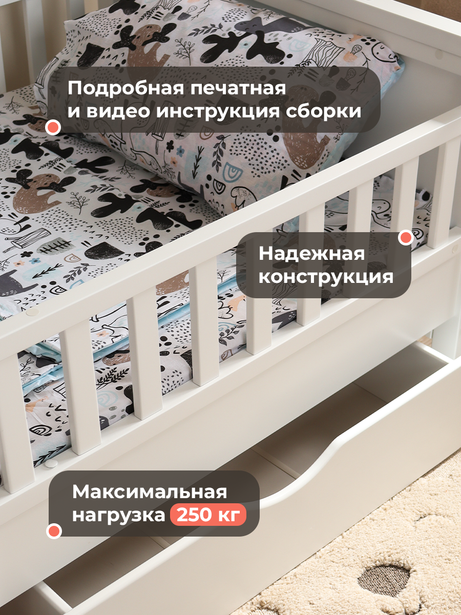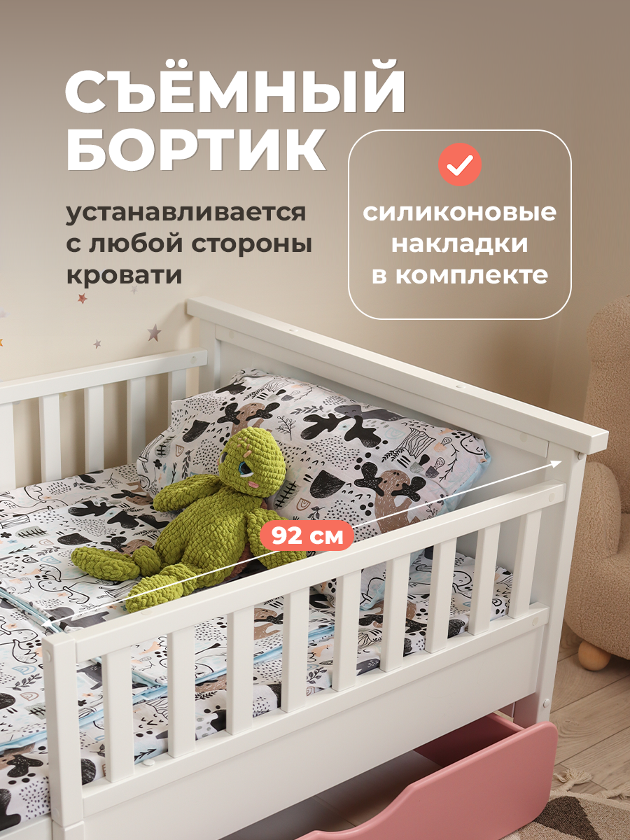 - Удобство и функциональность. Наша детская раздвижная кровать оснащена съемным бортиком, который обеспечивает дополнительную безопасность для вашего малыша. В первый год жизни можно ставить 2 бортика, а позже оставить 1 или убрать оба. Вместительный ящик позволит хранить постельное белье, игрушки и все необходимые вещи, которые нужно быстро спрятать, чтобы комната всегда оставалась аккуратной и уютной. Наличие ящика делает кровать-домик не только местом для сна, но и практичным элементом хранения.
