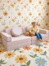 Диван состоит из 2 базовых матов, 2 треугольных, 2 круглых и 2 прямоугольных подушек, что позволяет создавать разнообразные конфигурации для игр и отдыха.