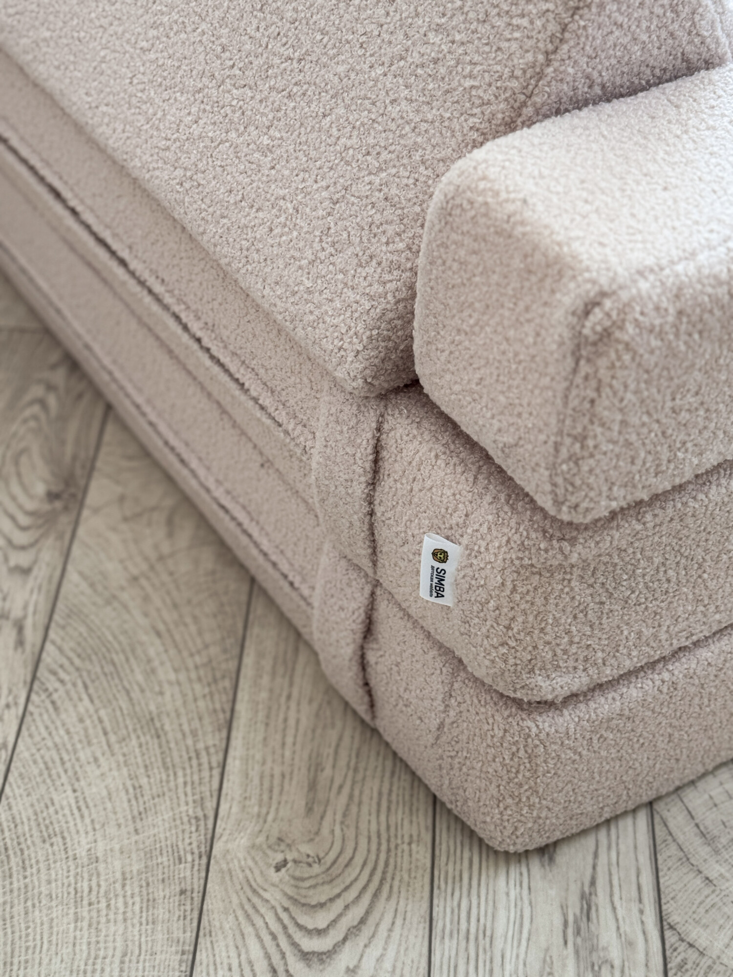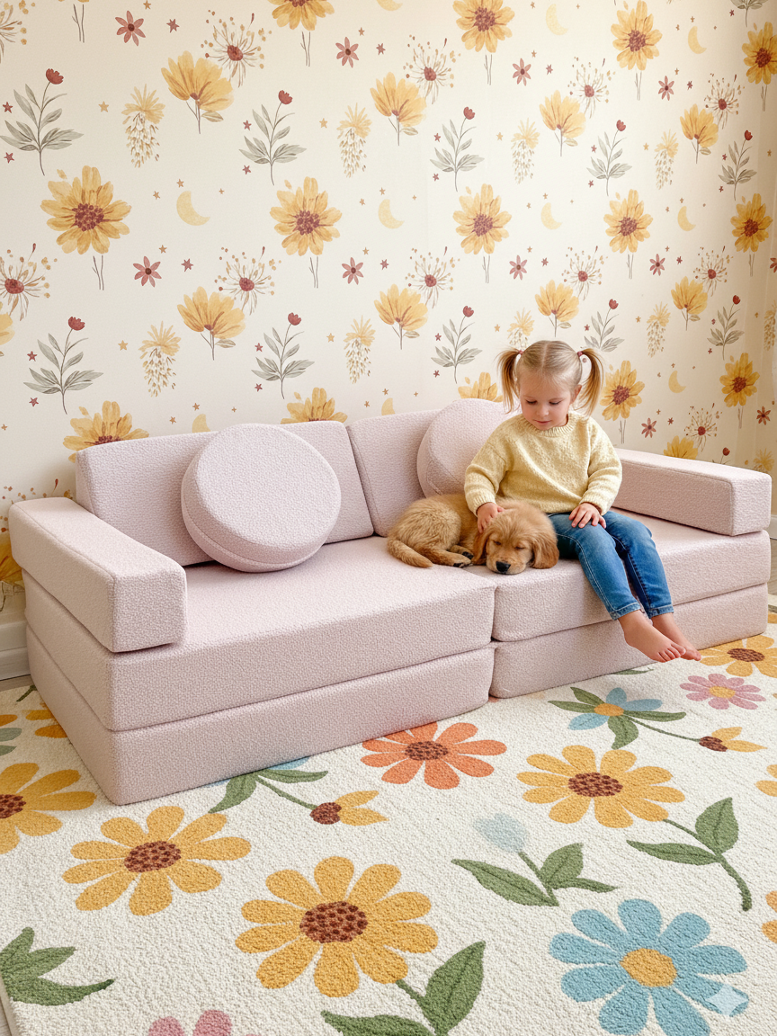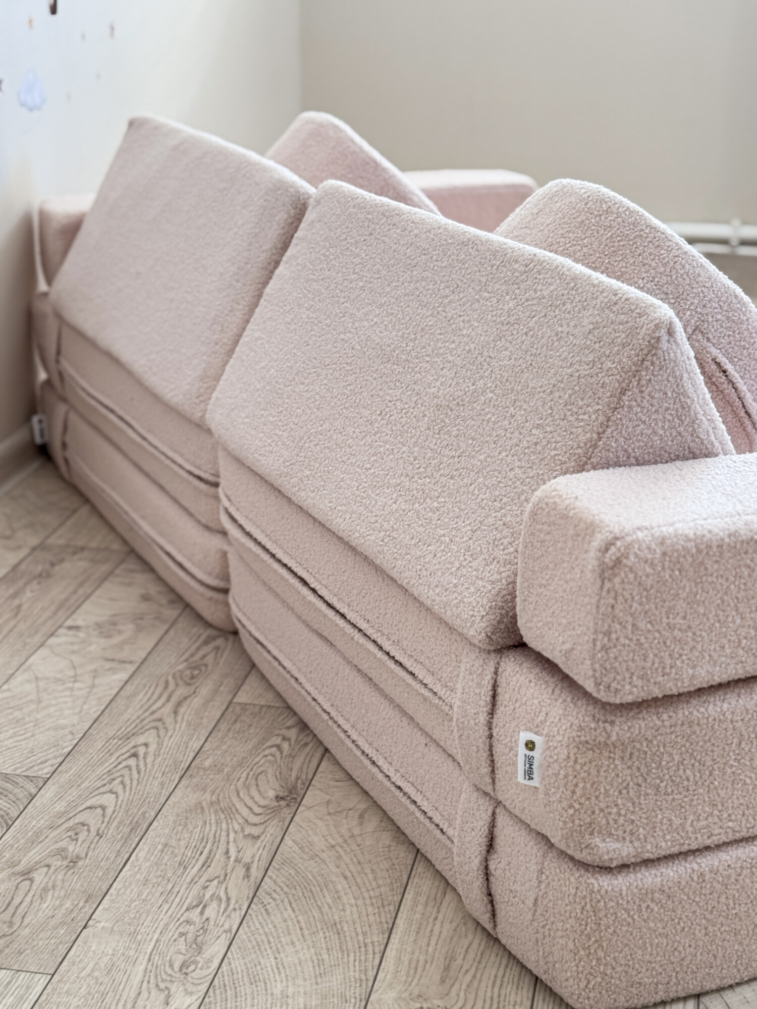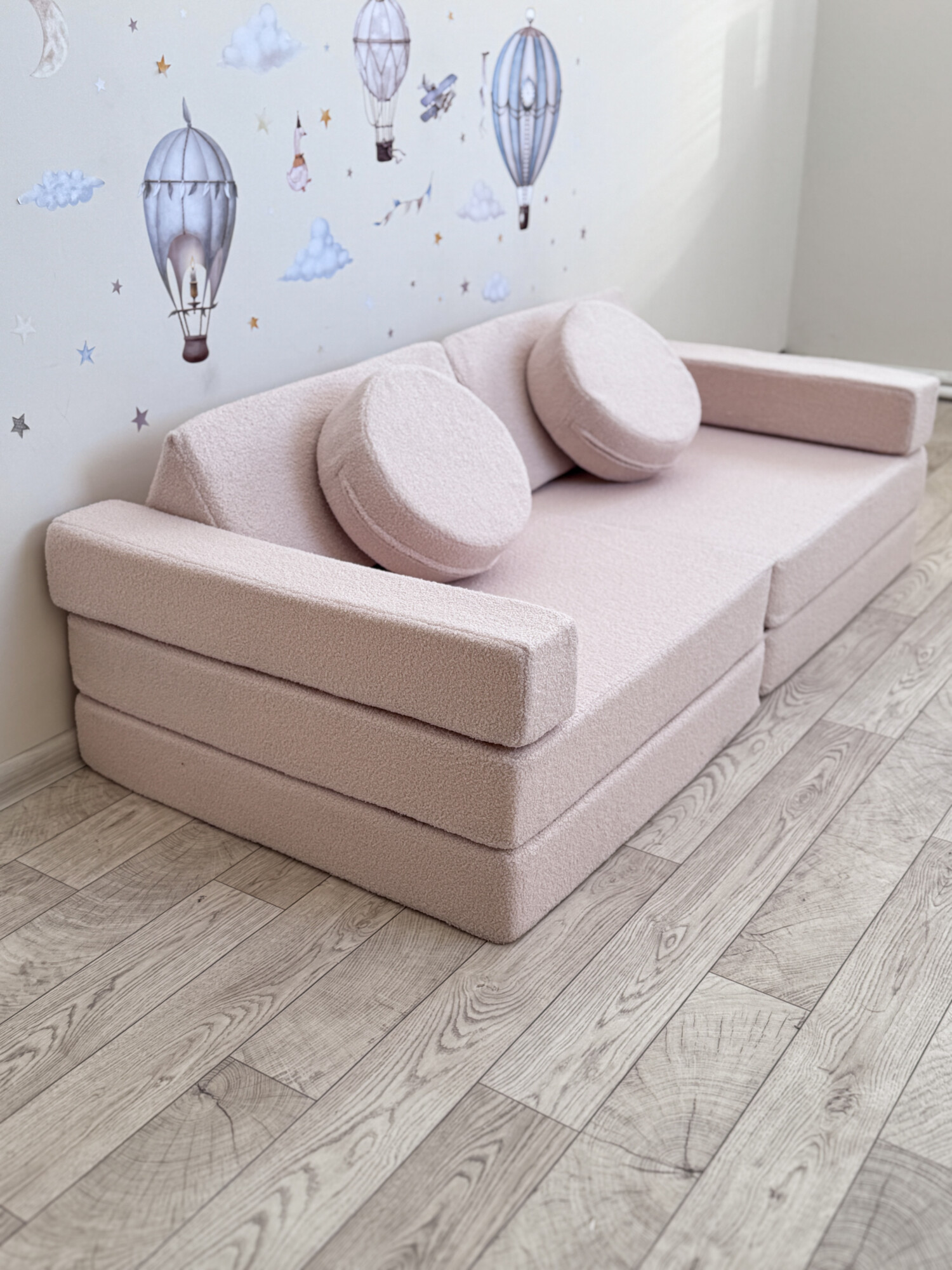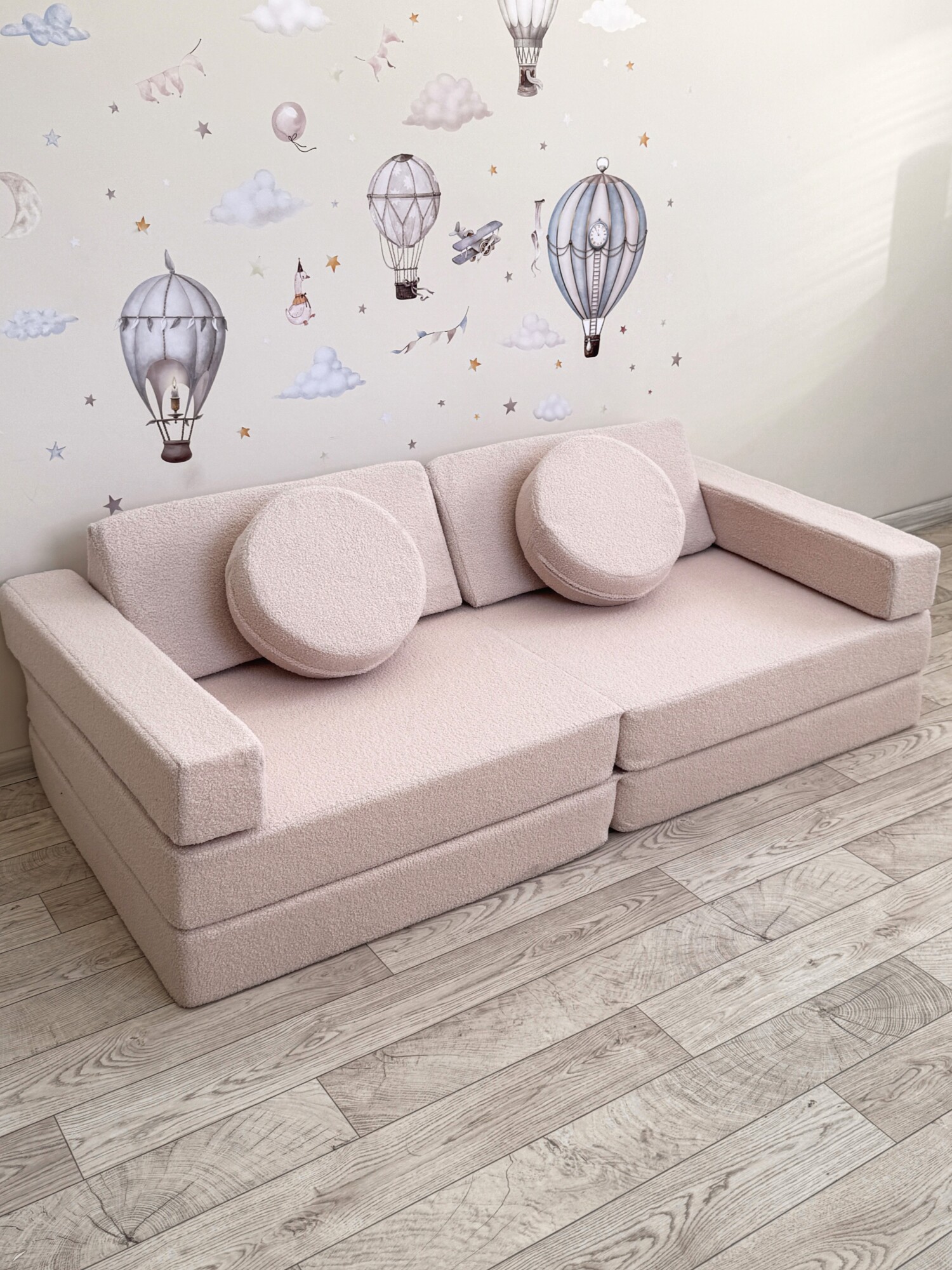 Изготовленный из высококачественной пены и обитый мягкой тканью букле, диван обеспечивает комфорт и безопасность. Используемые материалы экологичны и гипоаллергенны, что делает его идеальным для детей от 1 до 14 лет. Отсутствие острых углов и твердых каркасов снижает риск травм во время активных игр.
