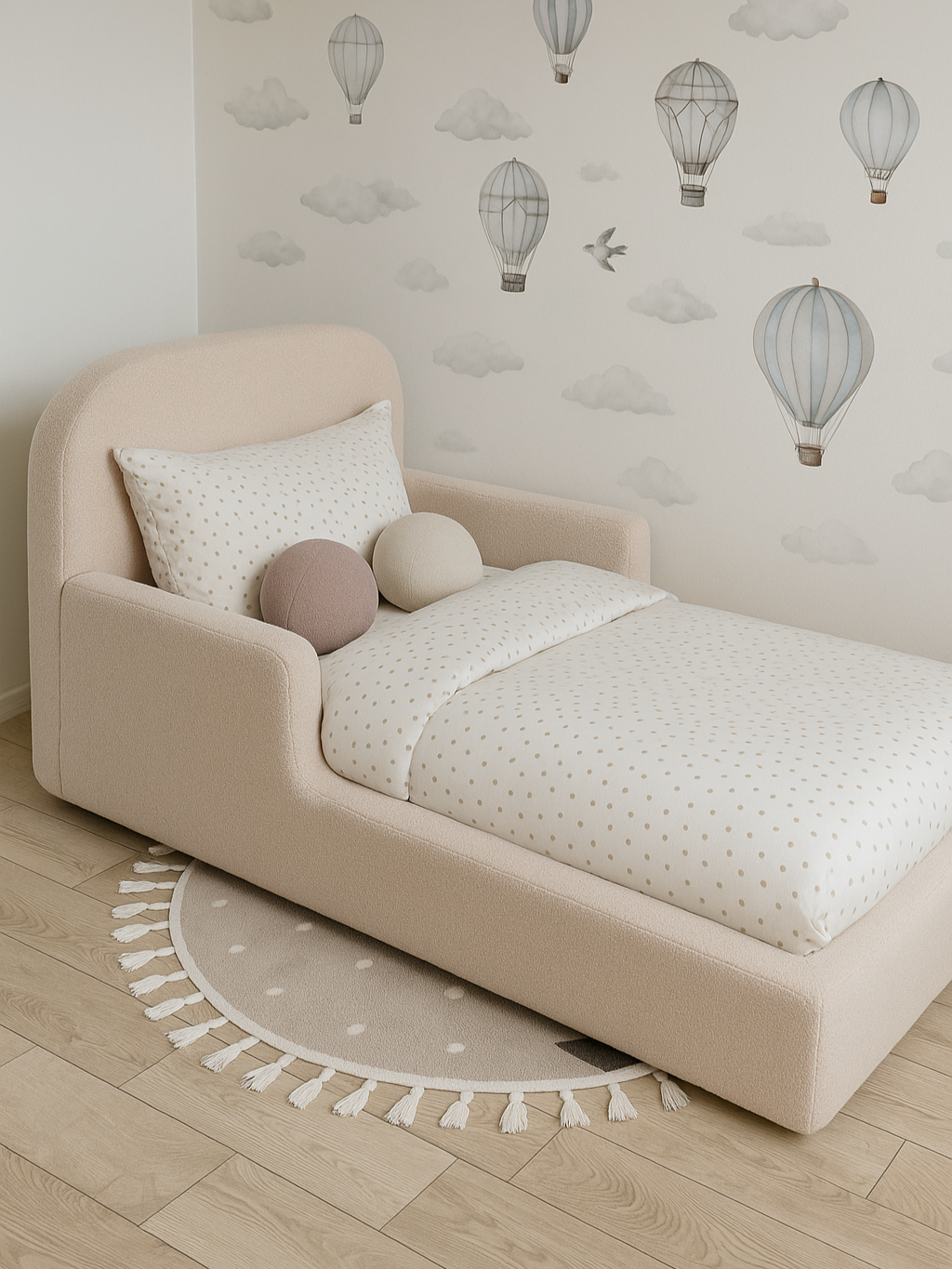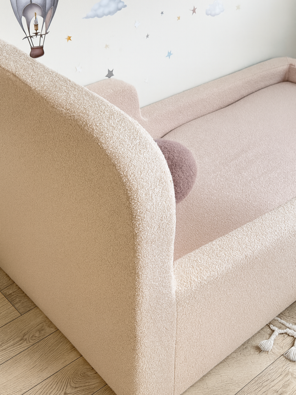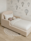 Детская бескаркасная кровать монтессори 160×80 состоит из мягкого изголовья и боковин из пены. Обивка изысканной тканью букле, обеспечивает мягкое прикосновение и удивительный дизайн. Кровать Монтессори была построена таким образом, чтобы способствовать физическому, умственному и эмоциональному развитию ребенка, а также дать ему возможность самостоятельно ложиться и вставать с кровати в любое время. Безопасность является решающим моментом, поскольку высота кровати позволяет вашему малышу безопасно входить и выходить из нее без риска несчастных случаев.
