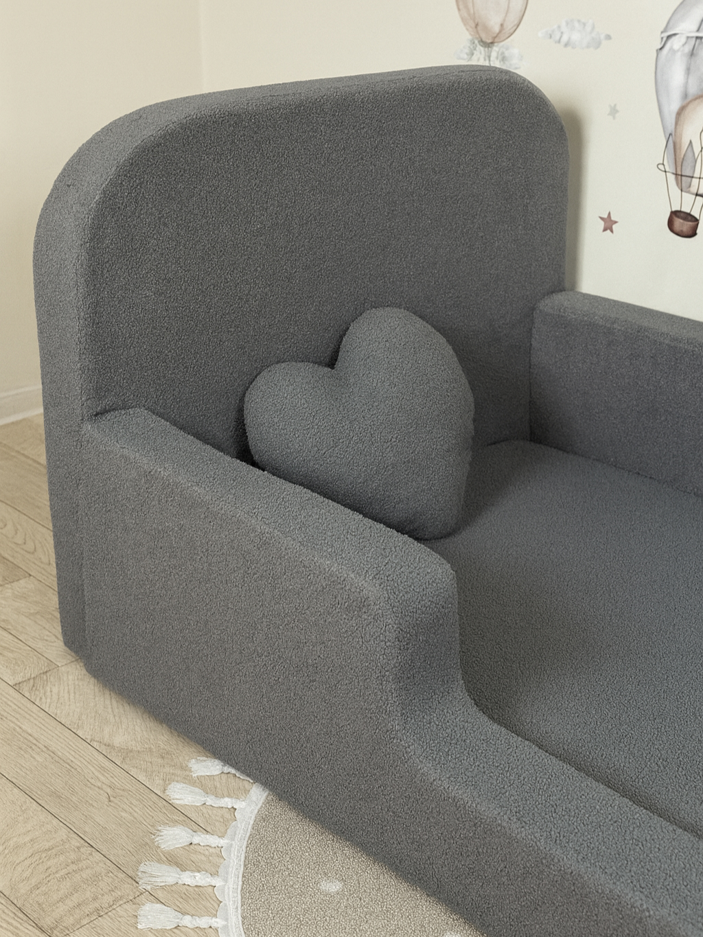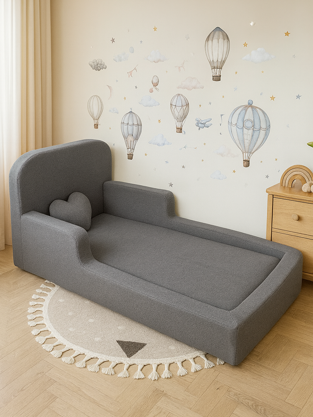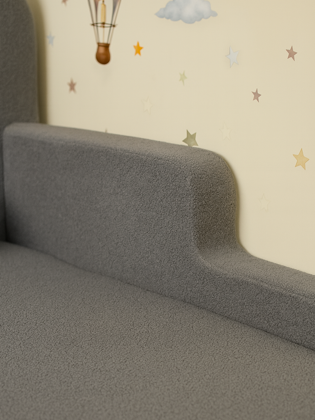 Детская бескаркасная кровать монтессори 160×80 состоит из мягкого изголовья и боковин из пены. Обивка изысканной тканью букле, обеспечивает мягкое прикосновение и удивительный дизайн. Кровать Монтессори была построена таким образом, чтобы способствовать физическому, умственному и эмоциональному развитию ребенка, а также дать ему возможность самостоятельно ложиться и вставать с кровати в любое время. Безопасность является решающим моментом, поскольку высота кровати позволяет вашему малышу безопасно входить и выходить из нее без риска несчастных случаев. Комфорт и безопасность Кровати SIMBA предназначена для обеспечения комфорта, практичности и безопасности для самых маленьких. Благодаря своей высоте и простому дизайну она поощряет независимость и автономию ребенка, позволяя ему легко просыпаться и вставать с постели. Ее размер идеально подходит для детей в переходной фазе, обеспечивая свободу, не теряя при этом уютного и безопасного прикосновения. Дизайн кроватки имеет мягкие линии и чистый вид, который идеально подходит для любого стиля и декора. Изготовленный из устойчивых и прочных материалов, он обеспечивает необходимую поддержку для обеспечения спокойных и безопасных ночей. Детская бескаркасная кровать имеет напольную конструкцию, что позволяет ребенку без ограничений исследовать свое пространство, стимулируя творческие способности и двигательное развитие. Спальня вашего ребенка приобретает не только функциональный предмет мебели, но и видное место в окружающем малыша мире. Идеально подходит для детей от 6 месяцев и старше, эта кровать обеспечивает удобное пространство для сна и игр, помогая развитию ребенка и поощряя здоровый отдых.