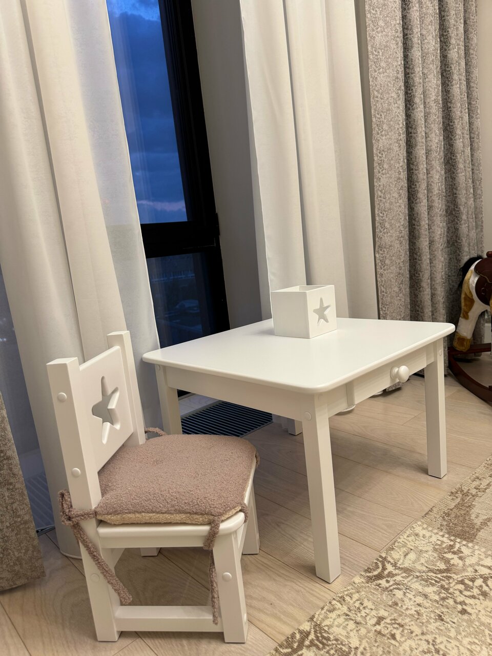 Отличный стол и стульчик! Качество прекрасное, все аккуратно сделано, мебель максимально безопасная для ребёнка. Выглядит очень эстетично ! А также отдельное спасибо, за индивидуальный подход к выполнению заказа ! Нам был интересен комплект растущей мебели в бело-бежевом цвете с мишкой на стуле (в о...Отличный стол и стульчик! Качество прекрасное, все аккуратно сделано, мебель максимально безопасная для ребёнка. Выглядит очень эстетично ! А также отдельное спасибо, за индивидуальный подход к выполнению заказа ! Нам был интересен комплект растущей мебели в бело-бежевом цвете с мишкой на стуле (в оригинале там ёлка) , и нашу просьбу выполнили - нам вдвойне приятно за такую возможность! Благодарим за мебель, ребёнок оценил и с удовольствием пользуется 😊 Все пришло целое, аккуратно упаковано, полный комплект. Собрали быстро. Благодарим за подарок в виде держателя для бумаги и рулон бумаги! Очень приятно ! Обязательно будем вас рекомендовать!