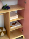 • Открытая полка с бортиками сверху — удобно размещать текстильные коробки, книги, сезонные вещи и декор.