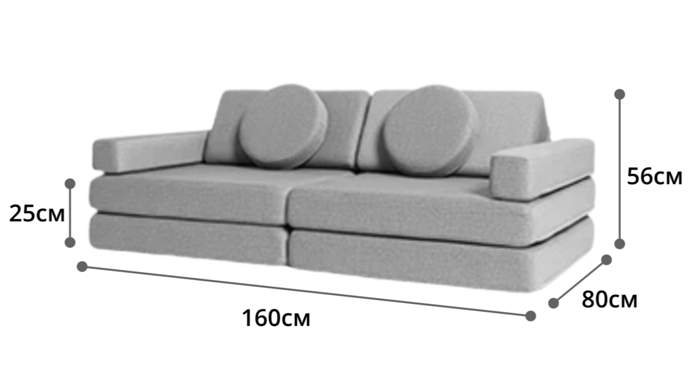 Съемные чехлы позволяют легко поддерживать чистоту, их можно стирать или заменить на другие, чтобы обновить внешний вид комнаты. Удобные ручки облегчают перемещение дивана по дому. В сложенном состоянии размеры дивана составляют 160 см в длину, 80 см в глубину и 56 см в высоту, с высотой сиденья 25 см. В разложенном виде он превращается в спальное место размером 160 см на 172,5 см, что особенно полезно для семей с несколькими детьми или частыми гостями.