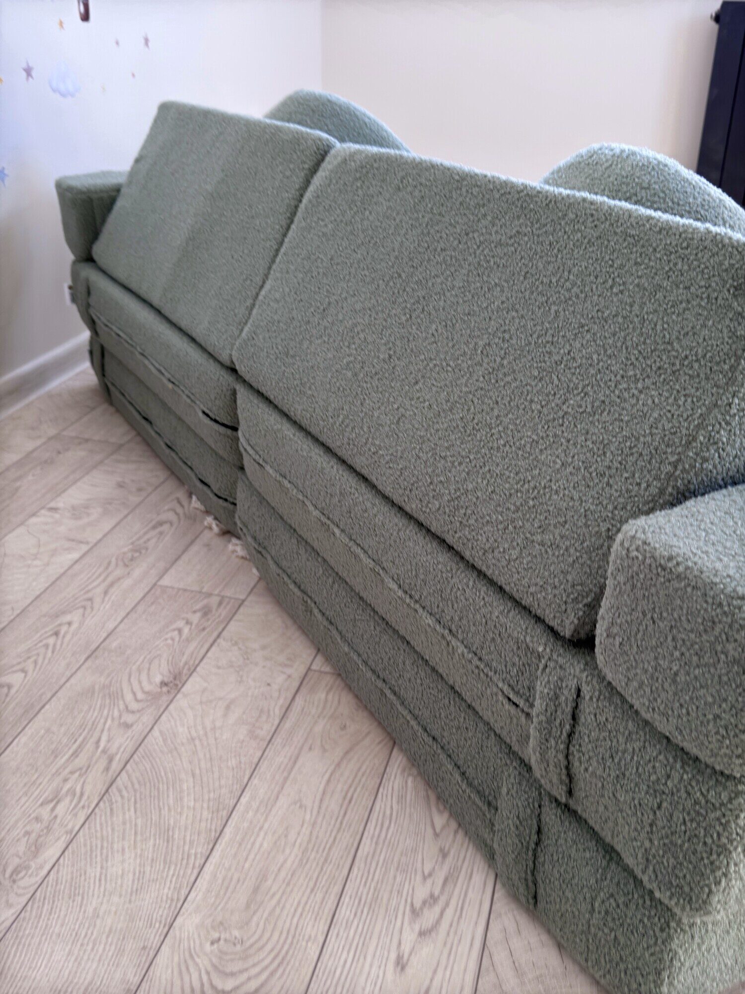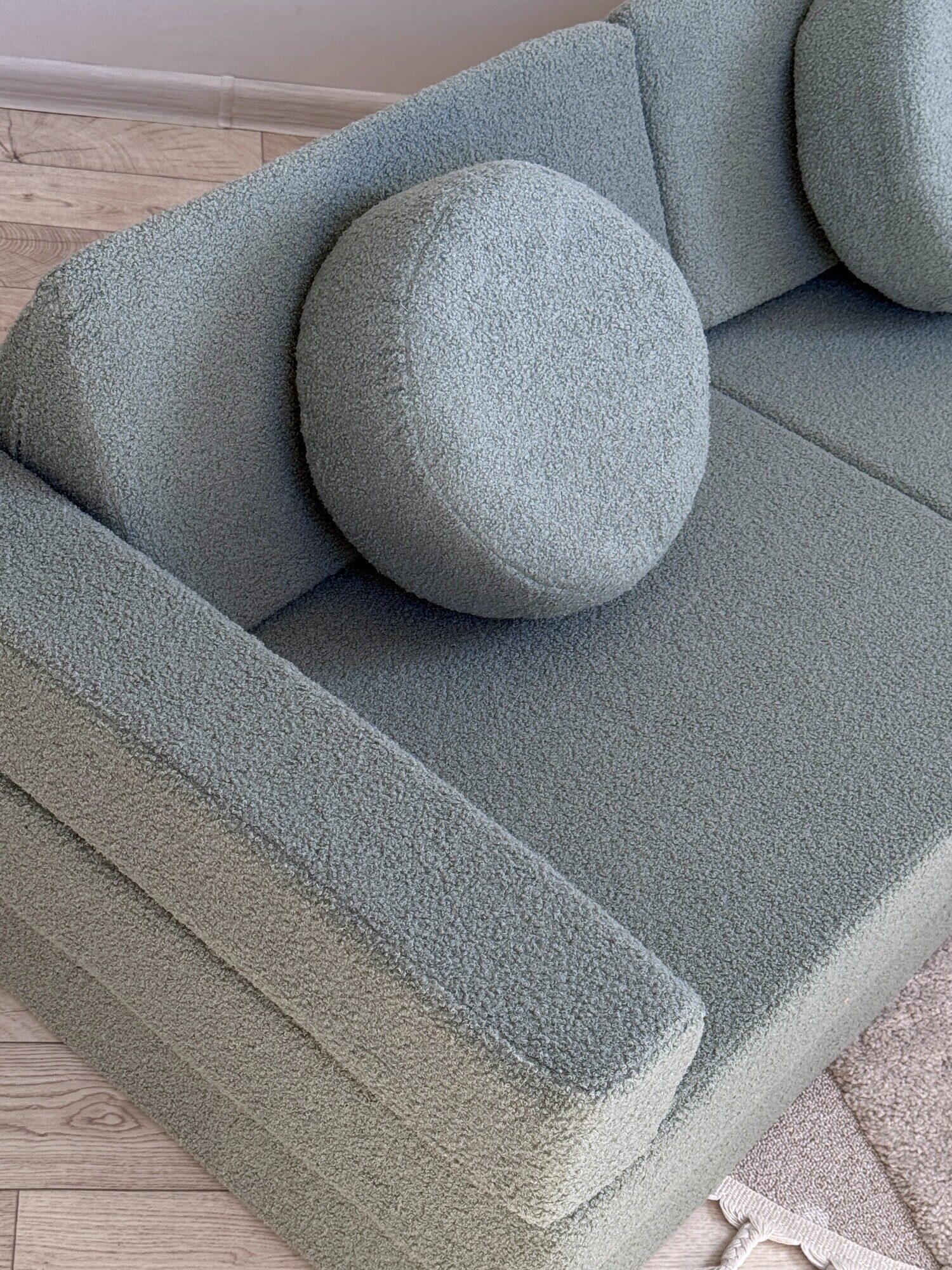 Изготовленный из высококачественной пены и обитый мягкой тканью букле, диван обеспечивает комфорт и безопасность. Используемые материалы экологичны и гипоаллергенны, что делает его идеальным для детей от 1 до 14 лет. Отсутствие острых углов и твердых каркасов снижает риск травм во время активных игр.
