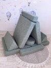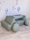 Диван состоит из 2 базовых матов, 2 треугольных, 2 круглых и 2 прямоугольных подушек, что позволяет создавать разнообразные конфигурации для игр и отдыха.