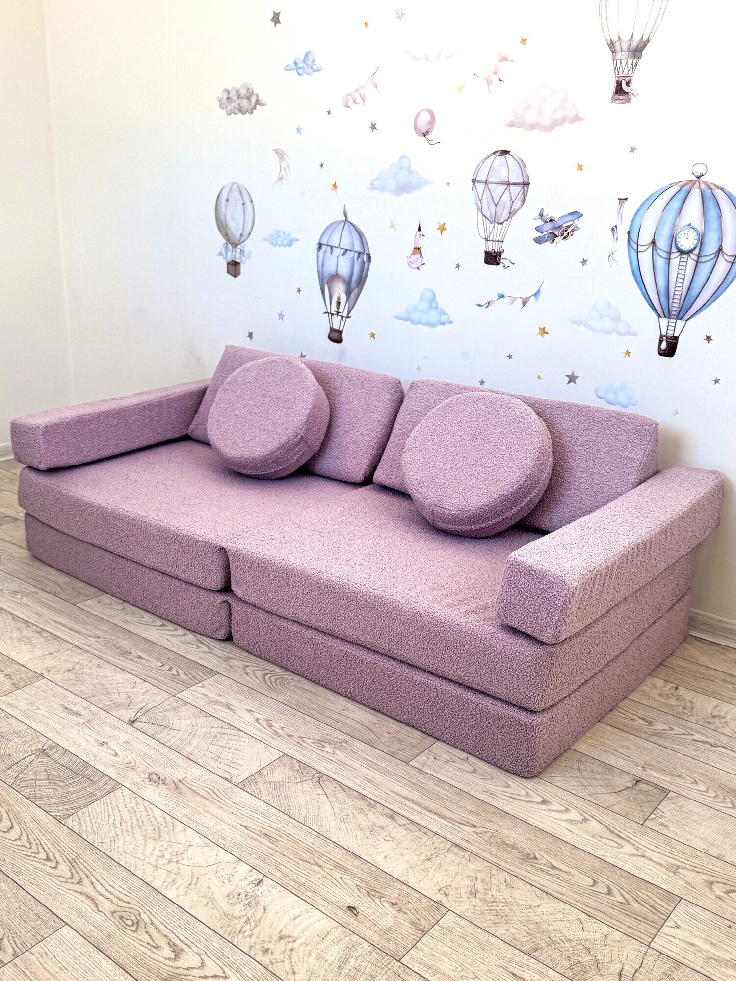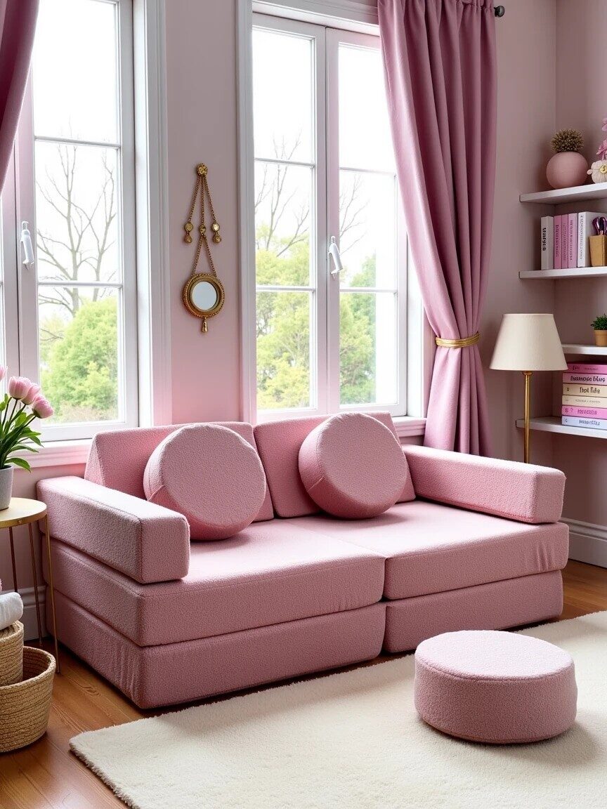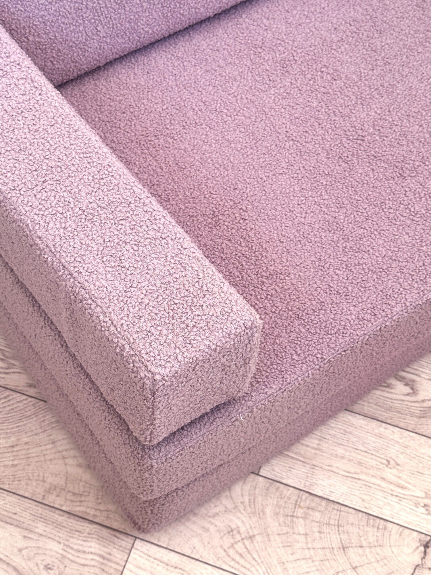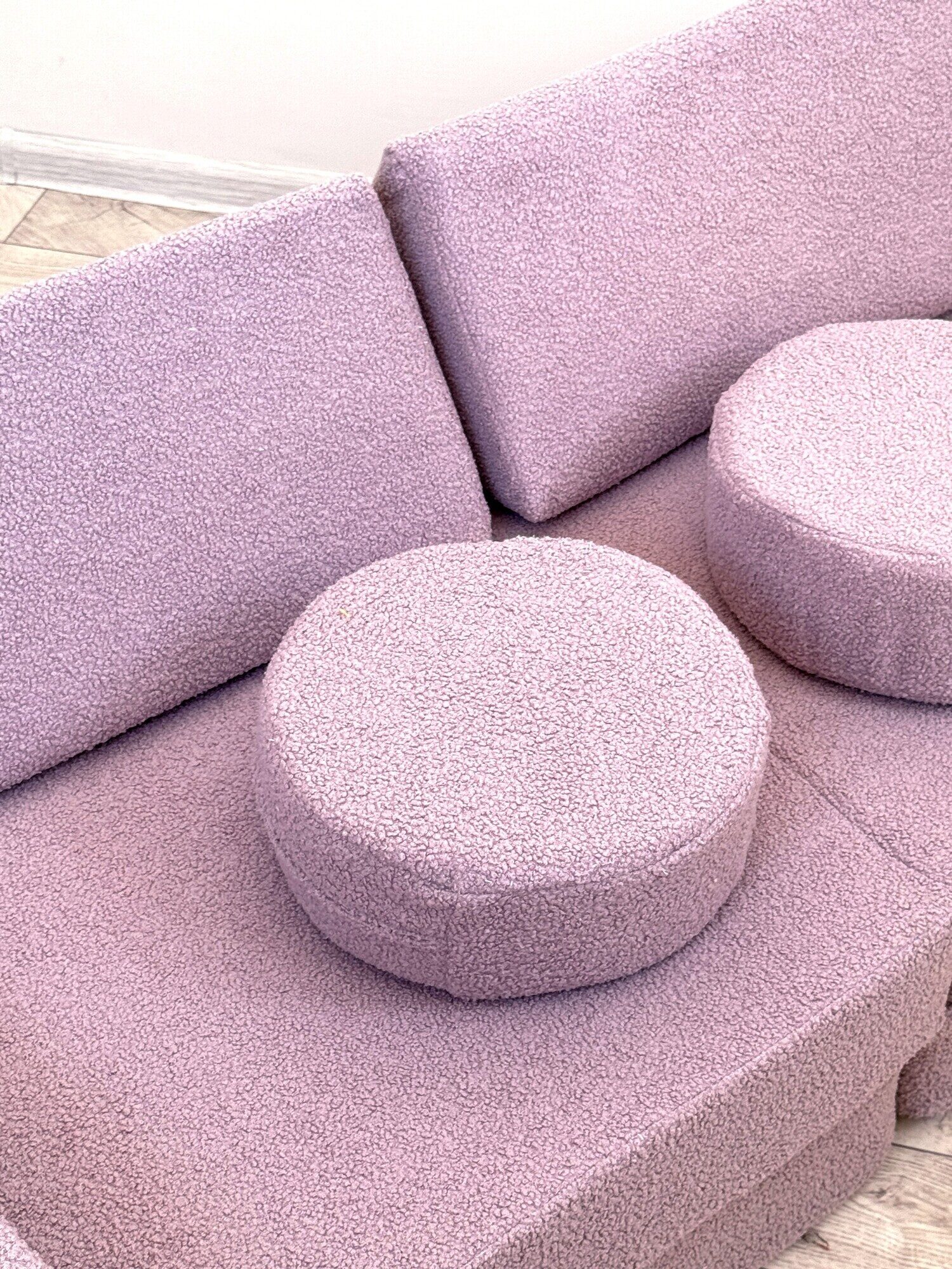 Изготовленный из высококачественной пены и обитый мягкой тканью букле, диван обеспечивает комфорт и безопасность. Используемые материалы экологичны и гипоаллергенны, что делает его идеальным для детей от 1 до 14 лет. Отсутствие острых углов и твердых каркасов снижает риск травм во время активных игр.