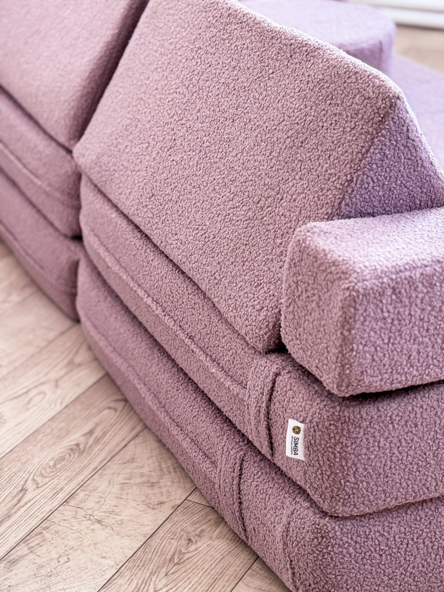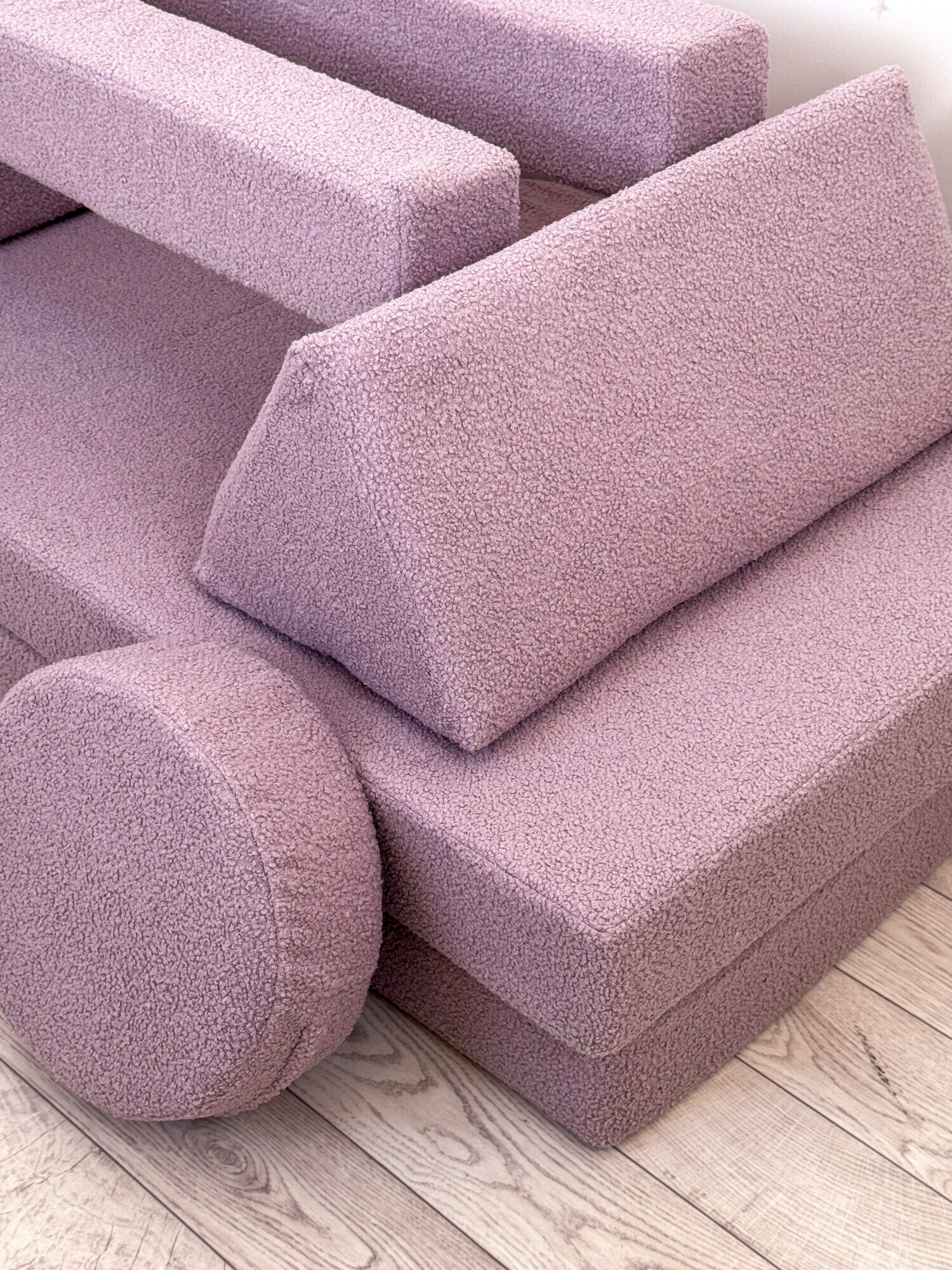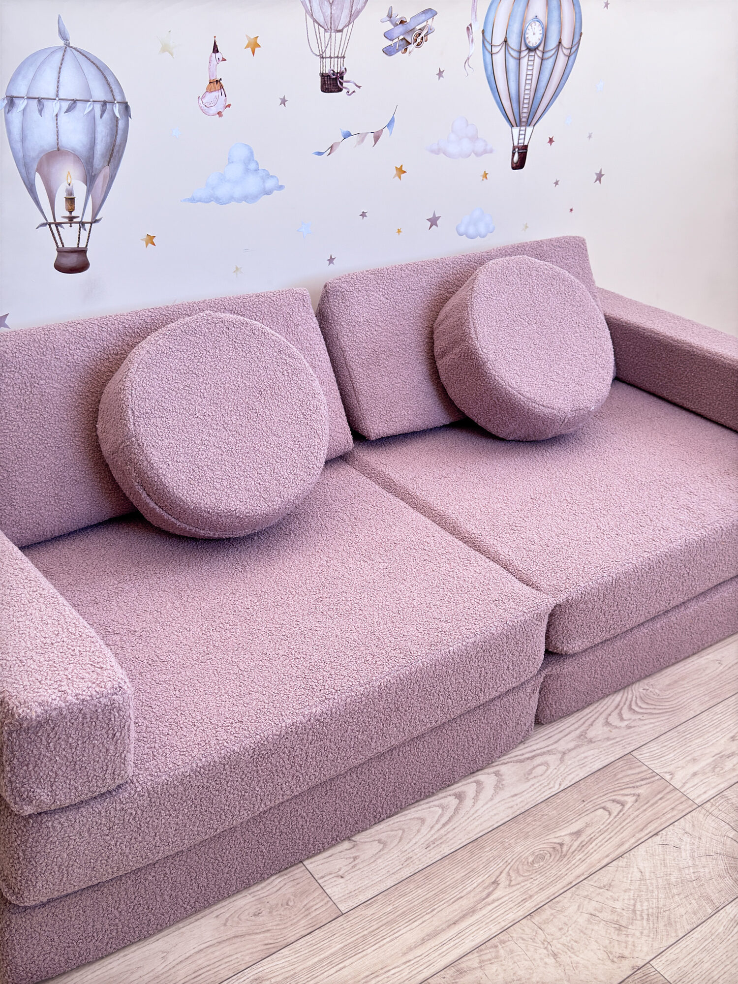 Изготовленный из высококачественной пены и обитый мягкой тканью букле, диван обеспечивает комфорт и безопасность. Используемые материалы экологичны и гипоаллергенны, что делает его идеальным для детей от 1 до 14 лет. Отсутствие острых углов и твердых каркасов снижает риск травм во время активных игр.