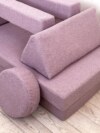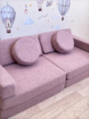 Диван состоит из 2 базовых матов, 2 треугольных, 2 круглых и 2 прямоугольных подушек, что позволяет создавать разнообразные конфигурации для игр и отдыха.
