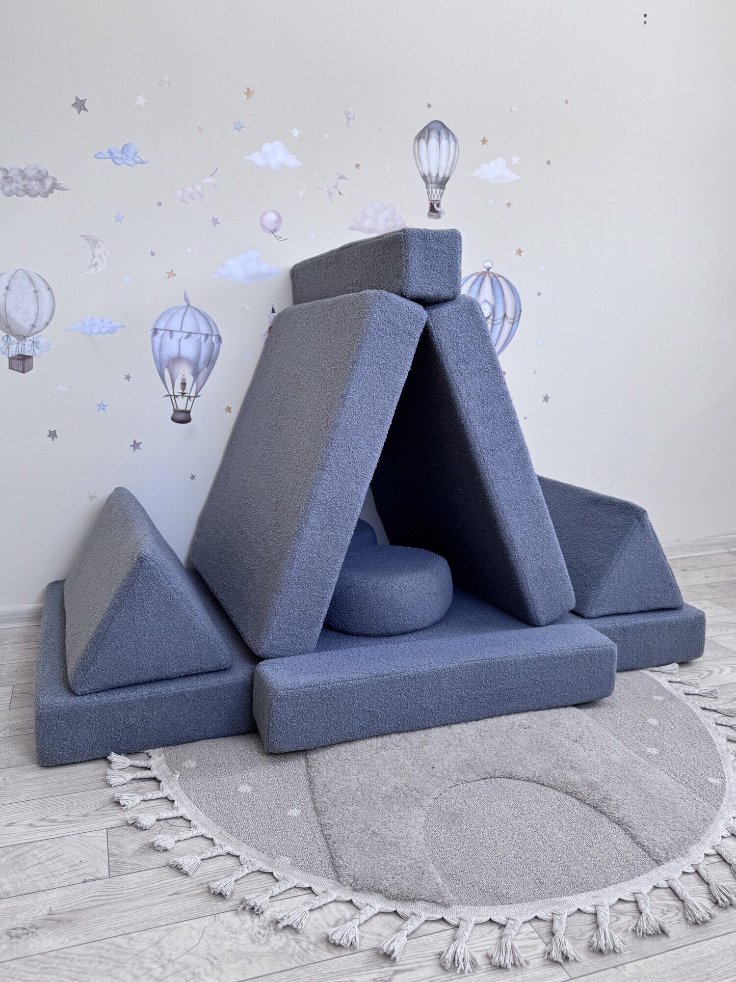 Диван состоит из 2 базовых матов, 2 треугольных, 2 круглых и 2 прямоугольных подушек, что позволяет создавать разнообразные конфигурации для игр и отдыха.