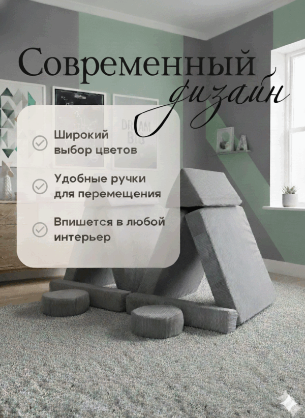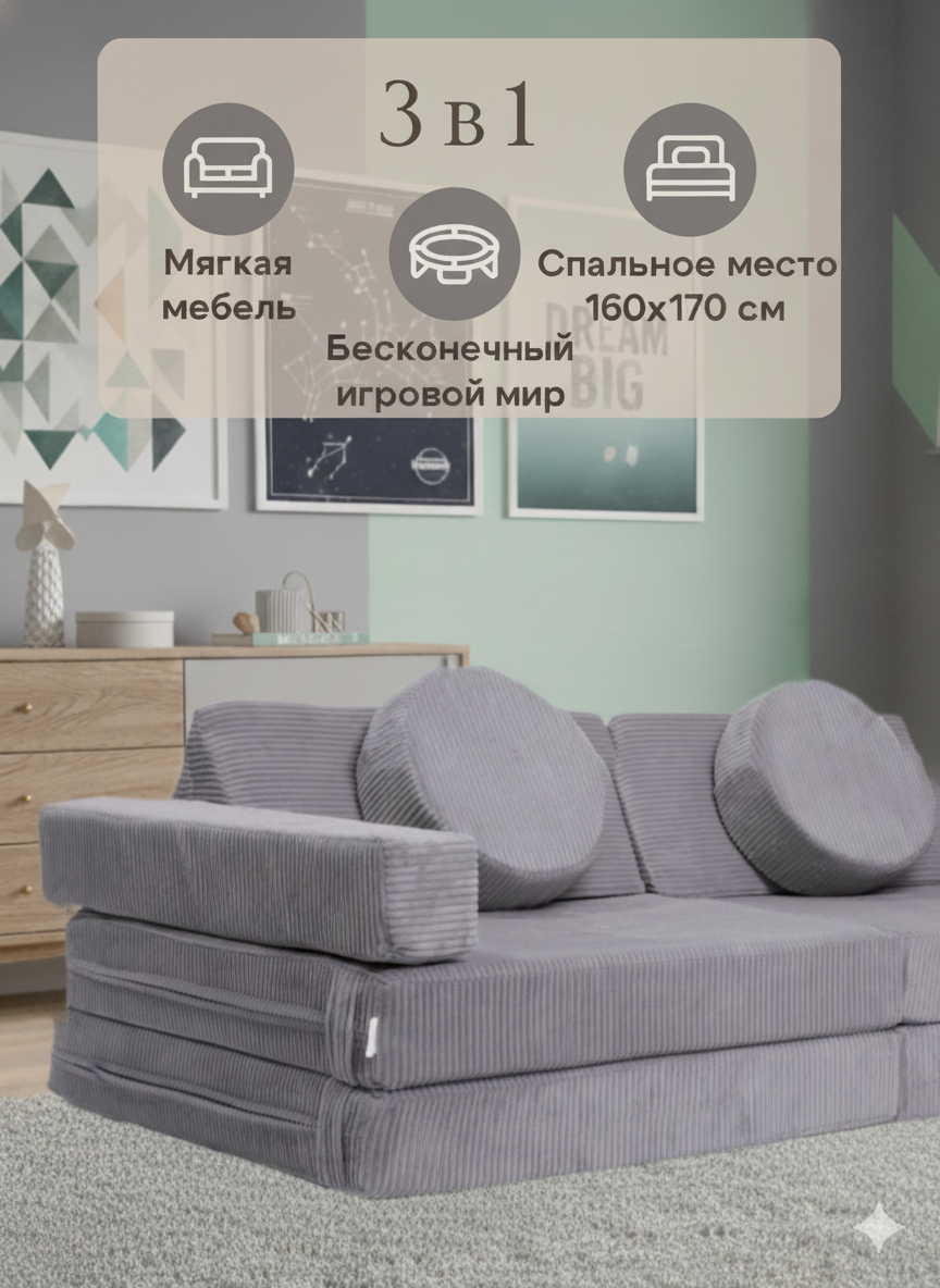 Этот диван способен принимать более 9 различных форм, стимулируя воображение и творческое мышление детей. Он легко превращается в замок, вигвам, корабль или ракету, предоставляя бесконечные возможности для игр и отдыха.