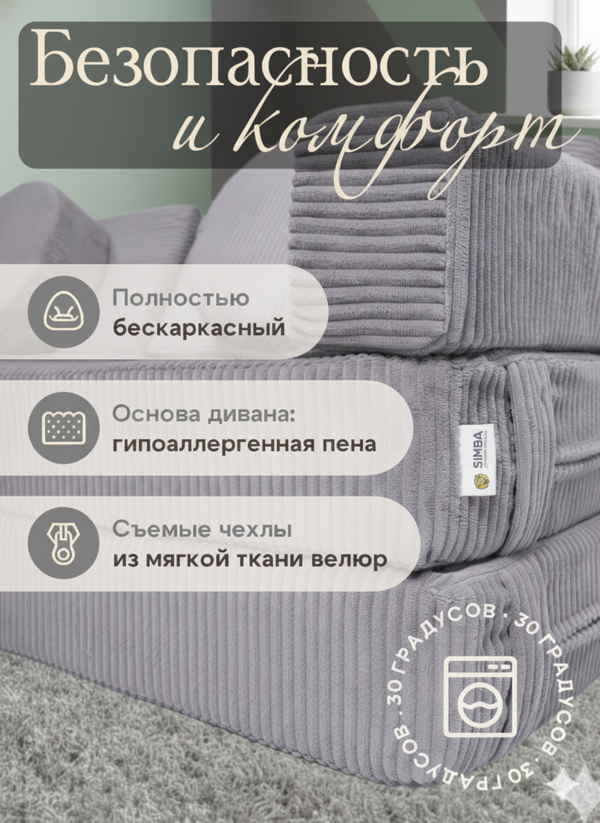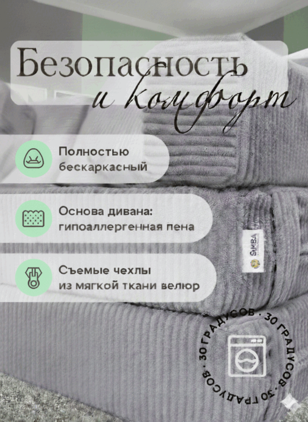 Изготовленный из высококачественной пены и обитый мягкой тканью букле, диван обеспечивает комфорт и безопасность. Используемые материалы экологичны и гипоаллергенны, что делает его идеальным для детей от 1 до 14 лет. Отсутствие острых углов и твердых каркасов снижает риск травм во время активных игр.