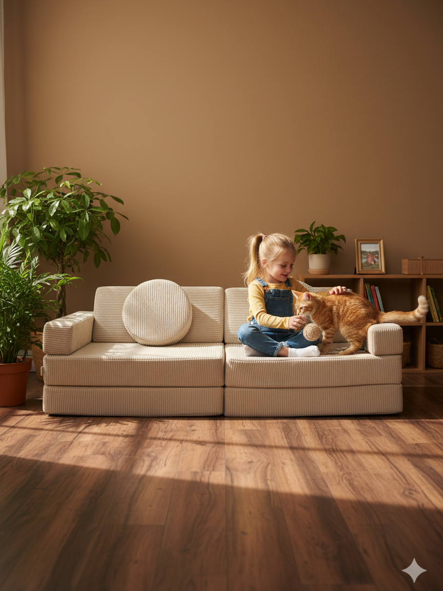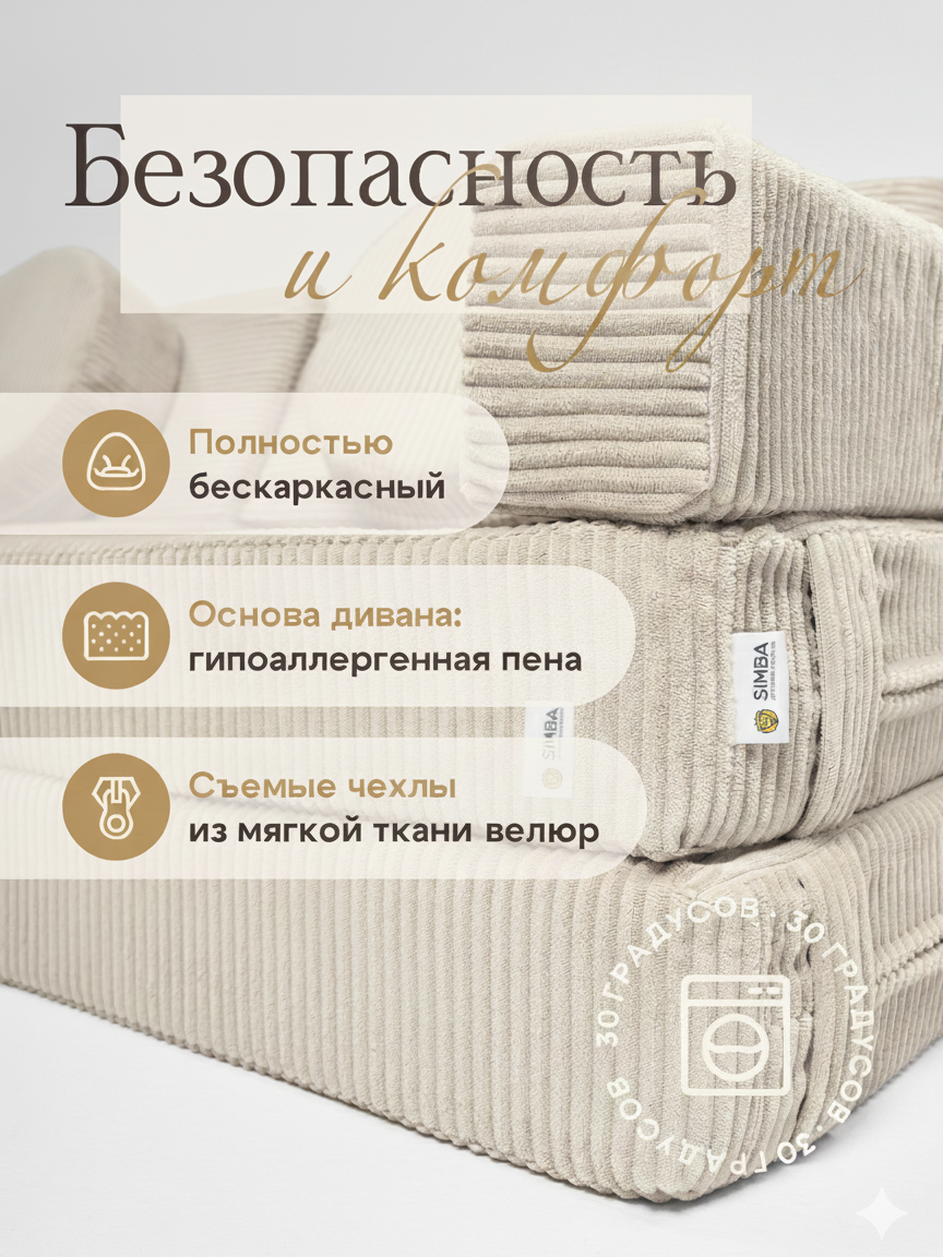 Изготовленный из высококачественной пены и обитый мягкой тканью букле, диван обеспечивает комфорт и безопасность. Используемые материалы экологичны и гипоаллергенны, что делает его идеальным для детей от 1 до 14 лет. Отсутствие острых углов и твердых каркасов снижает риск травм во время активных игр.