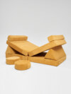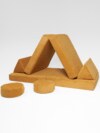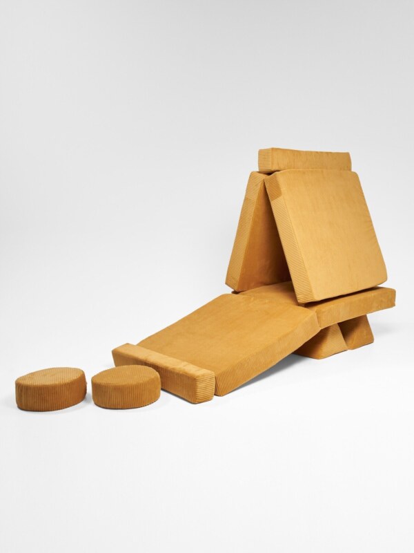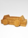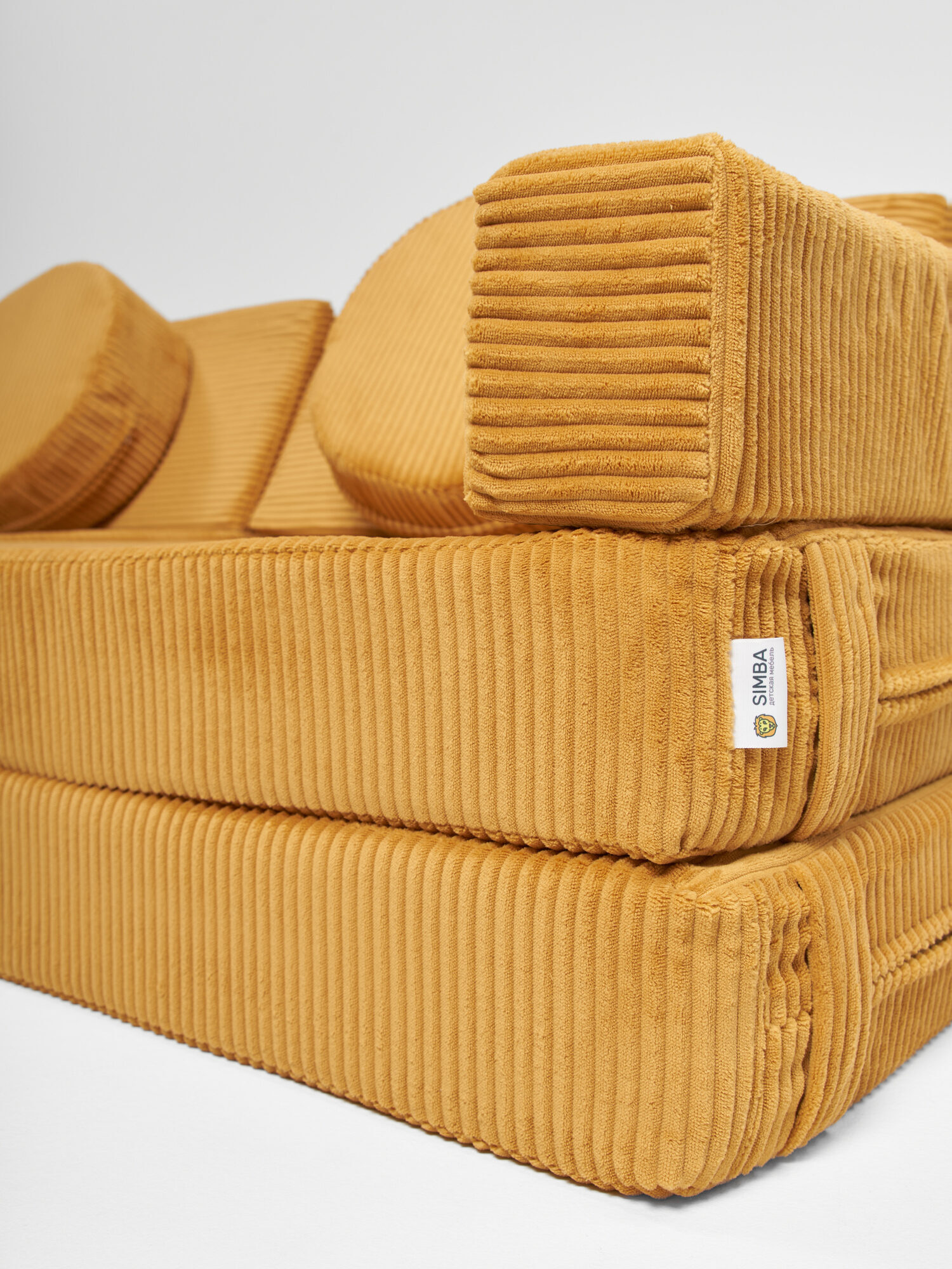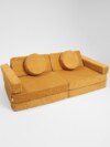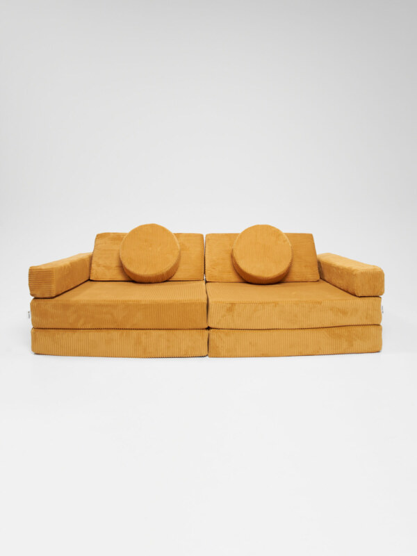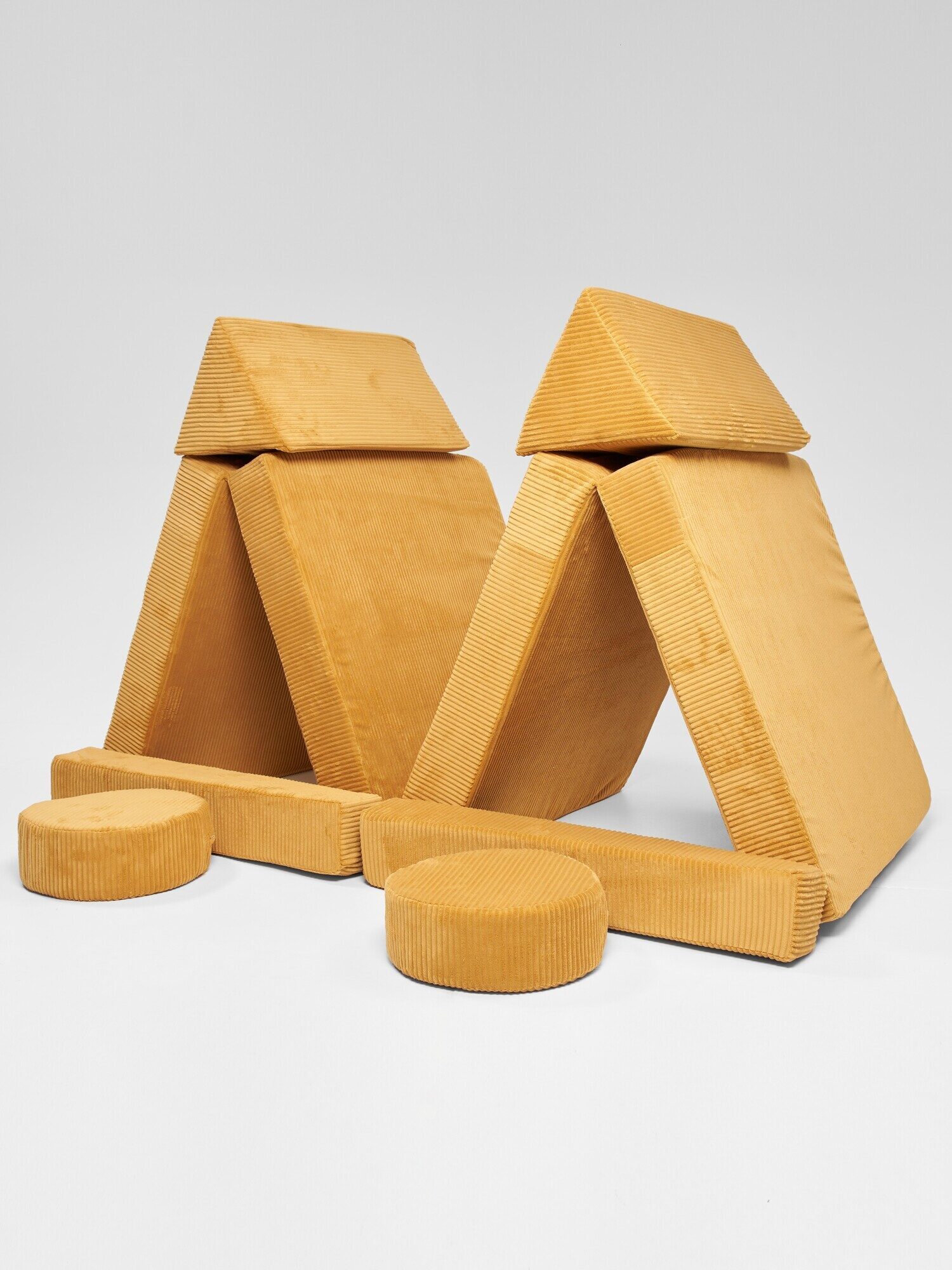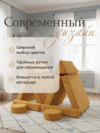 Диван состоит из 2 базовых матов, 2 треугольных, 2 круглых и 2 прямоугольных подушек, что позволяет создавать разнообразные конфигурации для игр и отдыха.