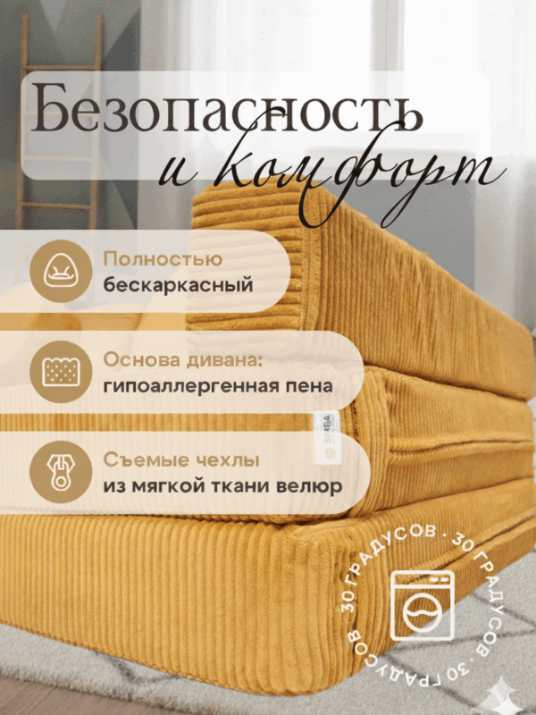 Изготовленный из высококачественной пены и обитый мягкой тканью букле, диван обеспечивает комфорт и безопасность. Используемые материалы экологичны и гипоаллергенны, что делает его идеальным для детей от 1 до 14 лет. Отсутствие острых углов и твердых каркасов снижает риск травм во время активных игр.