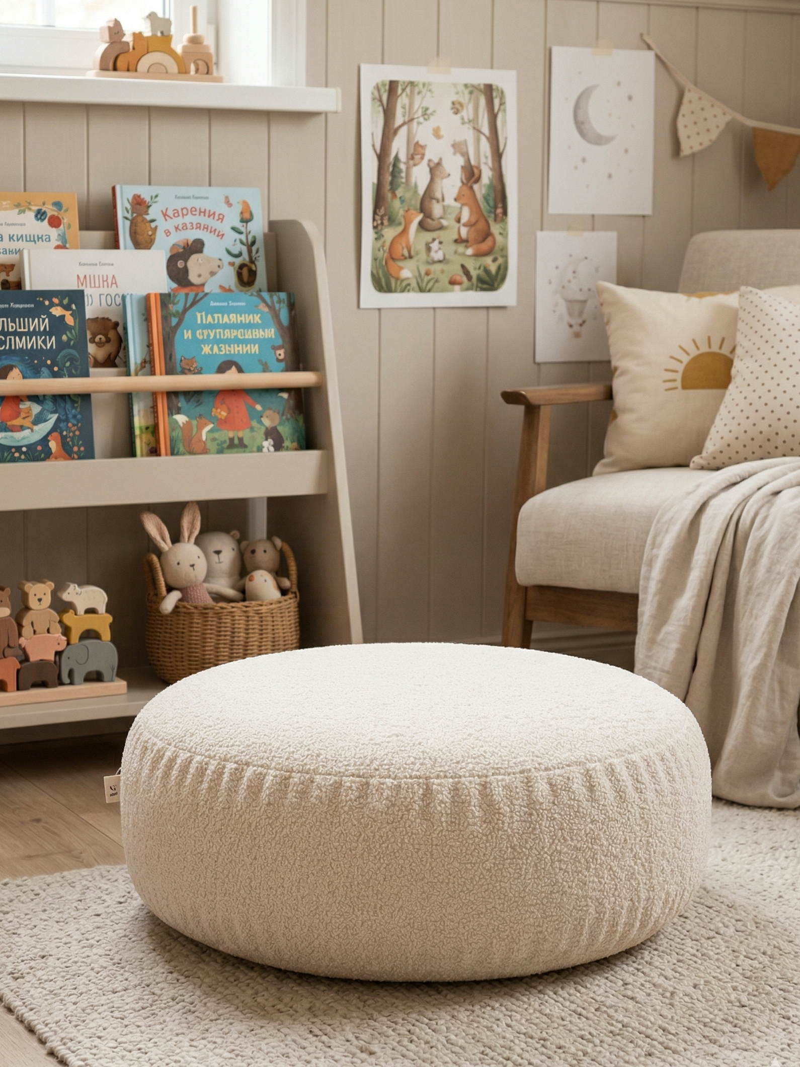 Этот круглый детский пуф создан для того, чтобы ребёнку было удобно сидеть, играть, отдыхать и просто находиться в красивом пространстве. За счёт мягкой формы и приятной текстуры он делает интерьер более тёплым, уютным и завершённым 🧸