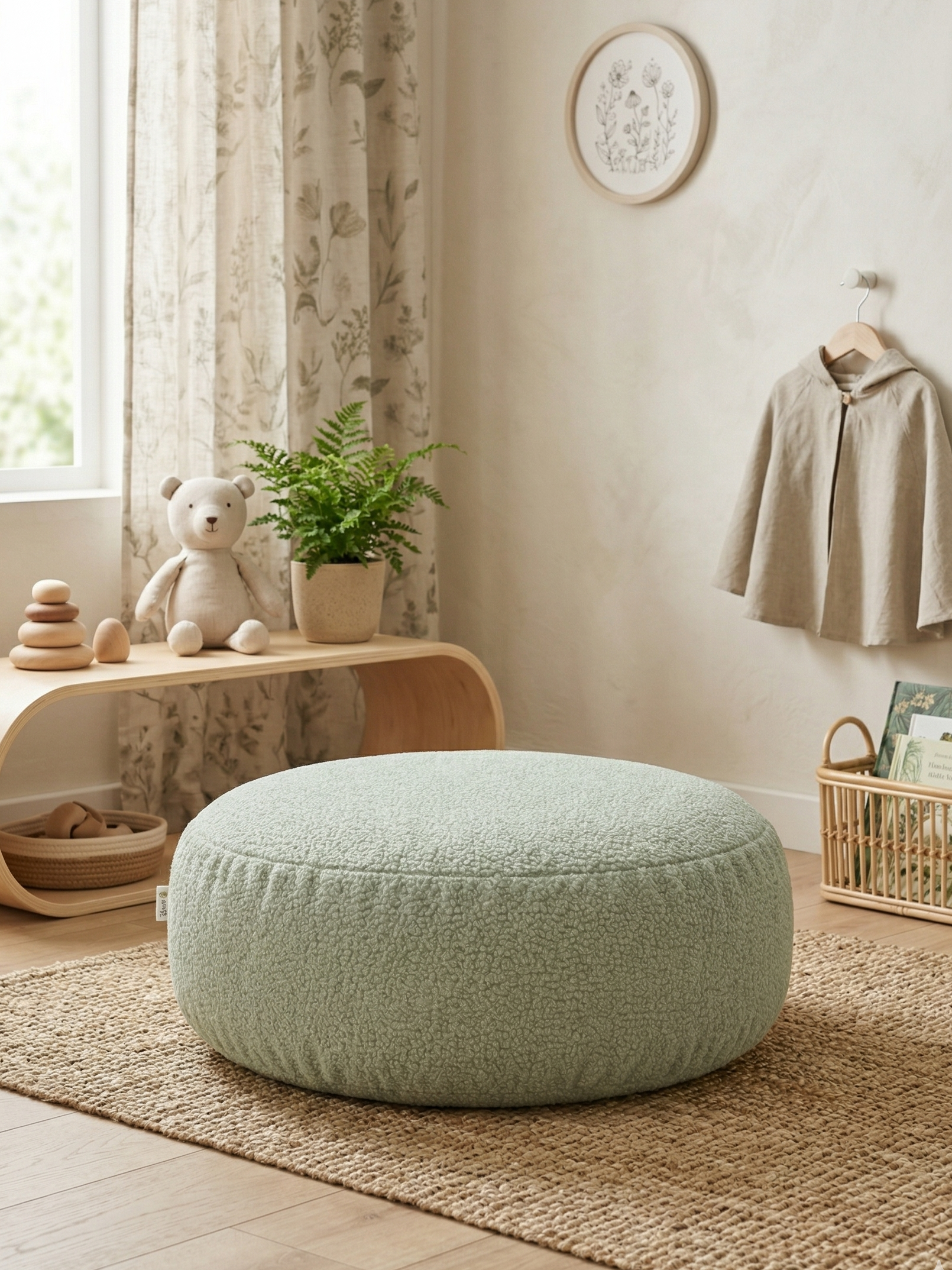Этот круглый детский пуф создан для того, чтобы ребёнку было удобно сидеть, играть, отдыхать и просто находиться в красивом пространстве. За счёт мягкой формы и приятной текстуры он делает интерьер более тёплым, уютным и завершённым 🧸