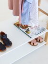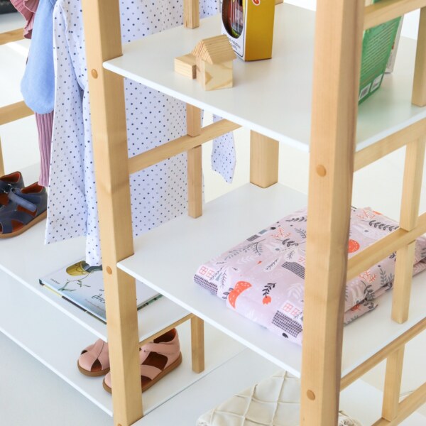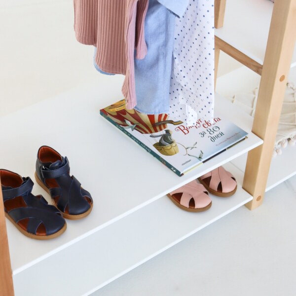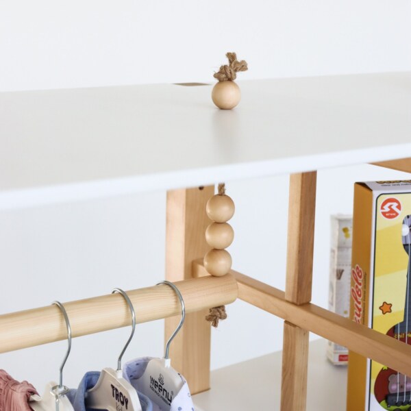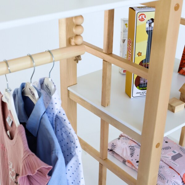 - Шкаф разработан с учетом принципов методики Монтессори, способствующей развитию самостоятельности и организации у детей. Он обладает низкими ящиками и открытыми полками, позволяя малышу самостоятельно доставать и убирать свои вещи, развивая навыки самообслуживания и порядка. Подвесная планка на низкой высоте обеспечивает легкий доступ к одежде, позволяя вашему малышу самостоятельно выбирать наряды.